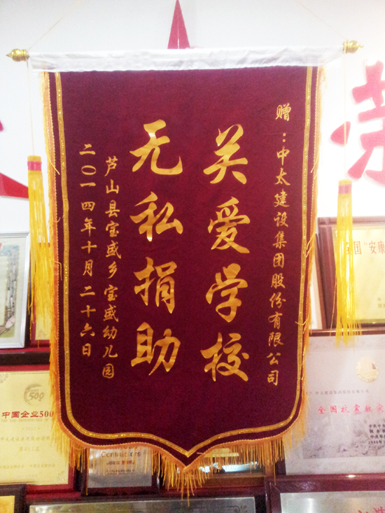 四川蘆山縣寶盛鄉幼兒園向中太建設集團贈送錦旗表示感謝