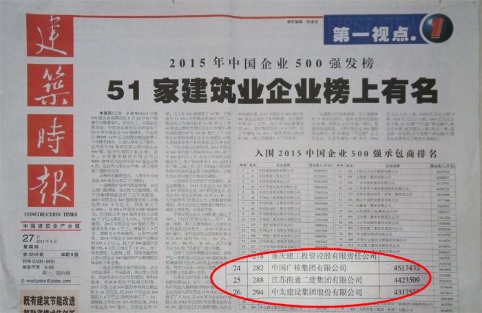 建筑時報8月27日報道了中太建設(shè)集團入圍2015年中國企業(yè)500強,在入圍的建筑承包商中排名第26位