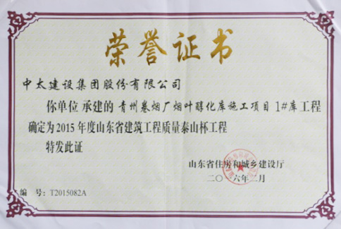 “泰山杯”獎(jiǎng)是山東省建筑行業(yè)工程質(zhì)量方面的最高榮譽(yù)獎(jiǎng),由山東省建設(shè)廳、山東省建筑工程管理局、山東省建筑業(yè)聯(lián)合會(huì)頒發(fā)。獲獎(jiǎng)工程位于山東省青州市玲瓏山北路1818號(hào),項(xiàng)目總投資6700萬(wàn)元,建筑內(nèi)容為41196平方米煙葉醇化庫(kù)主體和部分配套項(xiàng)目,工程自2012年11月20日開(kāi)工建設(shè),于2013年11月20日竣工驗(yàn)收完成。