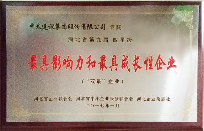 近日,河北省企業聯合會第六屆會員代表大會暨2017年河北省企業管理創新大會在石家莊召開,會議通報《河北省第九屆“最具影響力”“最具成長性”“最受關注企業家”評審結果》。中太建設集團獲評四星級“最具影響力和最具成長性企業”(“雙最”企業),李文健主席被授予“最受關注企業家”稱號。