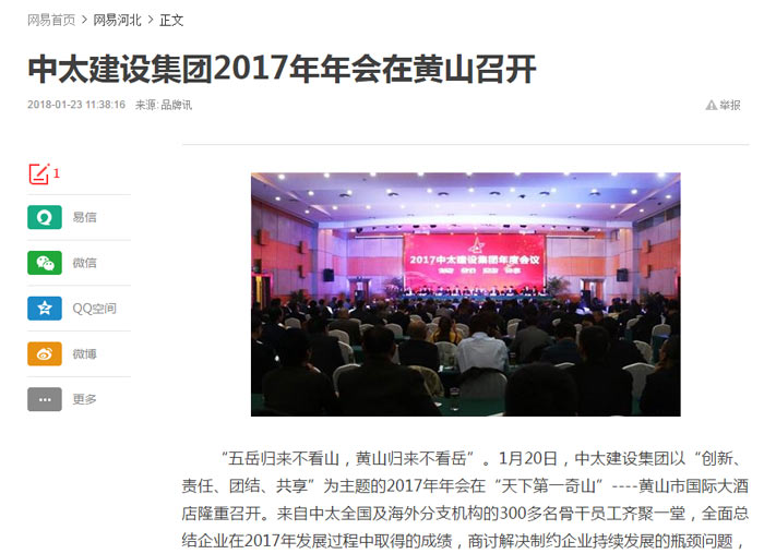 網(wǎng)易報(bào)道了“中太建設(shè)集團(tuán)2017年年會(huì)在黃山召開”