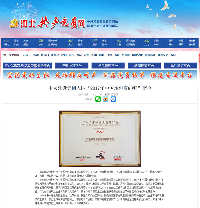 河北共產(chǎn)黨員網(wǎng)報道了“中太建設(shè)集團入圍“2017年中國承包商80強”榜單”