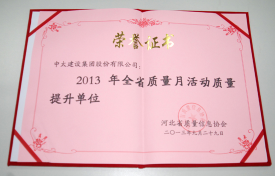日前,中太建設(shè)集團(tuán)被河北省質(zhì)量信息協(xié)會(huì)評(píng)為“2013年全省質(zhì)量月活動(dòng)質(zhì)量提升單位”。