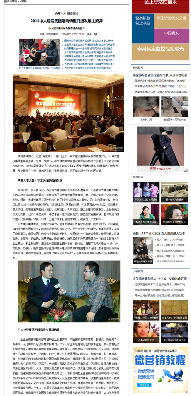 陜西傳媒網2014年01月05日報道了2014中太建設集團唱響轉型升級發展主旋律