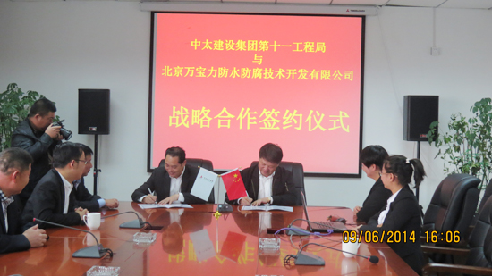 9月6日,中太建設(shè)集團第十一工程局與國內(nèi)防水工程行業(yè)知名企業(yè)——北京萬寶力防水防腐技術(shù)開發(fā)有限公司簽署合作協(xié)議,確立了防水工程服務(wù)戰(zhàn)略合作伙伴關(guān)系。十一局局長馬功云、副局長陳可偉、吳夕強以及萬寶力公司董事長王力共同出席了此次簽約儀式。